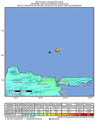 El Terremoto de Paciran de 2024 fue un movimiento sísmico ocurrido el 22 de marzo de 2024 a las 15:52 hora local (08:52 UTC). Tuvo una magnitud de 6.4 Mw.[1] Su epicentro se ubicó en la costa a 110 kilómetros al norte de Paciran, y ocurrió a una profundidad de 9.5 kilómetros.