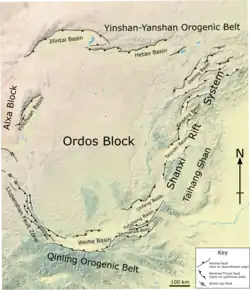 - ↑ Shi, W.; Dong, S.; Hu, J. (2019). «Neotectonics around the Ordos Block, North China: A review and new insights». Earth-Science Reviews 200: 102969. S2CID 210616833. doi:10.1016/j.earscirev.2019.102969.