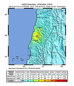 El terremoto de Vallenar de 2013 fue un sismo ocurrido a las 17:15 hora local del día miércoles 30 de enero de 2013. Tuvo una magnitud de 6,7 MW, y se percibió en las regiones chilenas de Antofagasta, Atacama, Coquimbo, Valparaíso, Metropolitana de Santiago, O'Higgins y Maule,[3] y en las provincias argentinas de La Rioja, San Juan, Mendoza, Córdoba, Catamarca y Tucumán.[4][5][6] Su epicentro se localizó a 46 kilómetros al noroeste de Huasco y a 56 kilómetros al nornoroeste de Vallenar,[7] en tanto que su hipocentro se ubicó a 52,2 kilómetros de profundidad bajo la corteza terrestre.