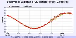 La ONEMI declaró una alerta preventiva de tsunami para las costas de las regiones de Valparaíso y O'Higgins.[32] A los minutos después el Servicio Nacional de Maremotos de Chile (SNAM) dependiente del Servicio Hidrográfico y Oceanográfico de la Armada de Chile (SHOA) descartó la probabilidad de un tsunami en las costas de Chile.[33] Sin embargo el tsunami si fue generado, según el Centro de Alerta de Tsunamis del Pacífico (PTWC, por sus siglas en inglés) las alturas máximas fueron; 16 cm en la ciudad de Valparaíso y 10 cm en la comuna de Quintero.[34]