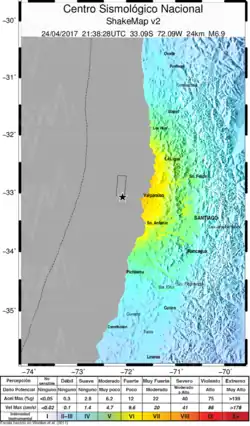 El terremoto de Valparaíso de abril de 2017 fue un fuerte movimiento telúrico que sacudió principalmente a las ciudades de Valparaíso y Santiago el lunes 24 de abril de 2017 a las 18:38 hora local. Su epicentro se localizó frente a las costas de la Región de Valparaíso y tuvo una magnitud de 6.9 Mw.[4][2][3] En la escala de Mercalli, el sismo alcanzó una intensidad VII.