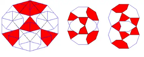 Existen, además, otras teselaciones no equivalentes relacionadas, como las hexágono-barco-estrella y la teselación de Mikulla–Roth. De este modo, si imponemos ciertas restricciones en los ángulos de la teselación rómbica surge una teselación binaria;[11] siendo su quíntupla su simetría subyacente pero no un quasicristal. Dicho patrón puede obtenerse bien marcando los rombos más pequeños de la teselación original o aplicando reglas de sustitución, pero no por el método de corte-proyección de Bruijn.[12]