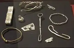 También se encontró un raro brazalete de oro (posiblemente procedente de Irlanda[5]) y un hacksilver (fragmentos de metal cortado a veces usados como moneda). Los informes demostraron que las monedas llevaban símbolos islámicos, cristianos y paganos: "algunas de las monedas mezclaban imaginería pagana y cristiana, arrojando luz sobre las creencias de los vikingos recientemente cristianizados".[1][3]
