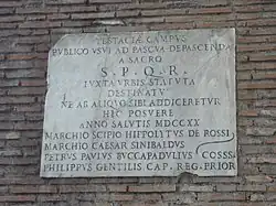- ↑ El texto de la placa que confirmó el uso público recita: Affinché nessuno possa appropriarsi dei campi del Testaccio, destinati a pascolo per uso pubblico con sacro editto del Senato e del Popolo Romano secondo gli statuti della città, posero [questa lapide] nell'anno 1720 i consoli marchese Scipione Ippolito de Rossi, marchese Cesare Sinibaldi, Pierpaolo Boccapaduli e Filippo Gentili capitano del rione («Para que ninguno pueda apropiarse de los campos del Testaccio, destinados a pasto para uso público con edicto sagrado del Senado y del Pueblo Romano según los estatutos de la ciudad, colocaron [esta placa] en el año 1720 los cónsules marqués Scipione Ippolito de Rossi, marqués Cesare Sinibaldi, Pierpaolo Boccapaduli y Filippo Gentili capitán del rione»).