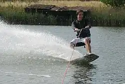 Obstáculo: Un integrante de cada equipo debía subirse a una tabla de wakeboard y mantenerse de pie por un minuto. Al lograrlo recibirían la siguiente pista.