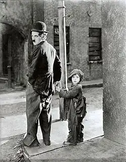 ![]() Charles Chaplin y Jackie Coogan en una foto publicitaria de la película. | ||