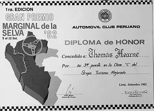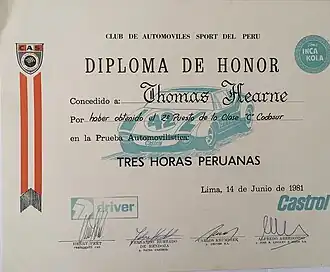 Aquí cabe destacar que Thomas Hearne ganó una de la más importantes carreras de mayor trascendencia en Perú y es "Caminos del Inca" en los años 1969, 1978, 1980 y 1981. En esta carrera se pone a prueba la destreza de los pilotos y la resistencia de los autos.