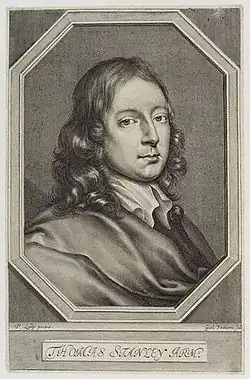 Thomas Stanley (1625 - 12 de abril de 1678) fue un escritor y traductor inglés. De familia aristocrática, y vinculado por su madre a la familia del poeta Richard Lovelace,[1] Stanley es considerado una figura de transición en la literatura inglesa. Formado en la Universidad de Cambridge, donde obtuvo el grado de Master of Arts, casó pronto, viajó con frecuencia a la Europa continental, y dada su desahogada posición económica, ayudó a diversos poetas y escritores coetáneos. Fue poeta él mismo y traductor de autores como Girolamo Preti, Juan Pérez de Montalbán, o Anacreonte. Su poesía está influida en los antiguos, por Mosco de Siracusa o Ausonio, y en los modernos por Góngora, Johannes Secundus y Giambattista Marino. Es conocido más generalmente, sin embargo, por su obra The History of Philosophy, publicada en Londres en cuatro volúmenes, desde 1655 hasta 1662. Concebida como una serie de biografías, iniciada por la de Tales, fue altamente valorada como pieza literaria y de erudición sobre la filosofía de la Antigüedad, durante todo el siguiente siglo, haciéndose eco de ella, por ejemplo, en España el padre Benito Jerónimo Feijoo en sus Cartas eruditas y curiosas.[2]