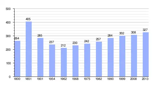 Los datos demográficos contemplados en este gráfico de la comuna de Thomer-la-Sôgne[4] se han cogido de 1800 a 1999 de la página francesa EHESS/Cassini, y los demás datos de la página del INSEE.[5]