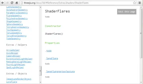 Actualmente está incompleta y la existente está muy poco elaborada, por lo que gran parte del aprendizaje es realizado a través de la lectura e interpretación directa del código, así como alguna bibliografía (relacionada más abajo) y tutoriales en internet. Sin embargo cualquiera con conocimiento puede colaborar, yendo directamente a la documentación en el sitio Threejs.org y presionando el botón "Edit this page" en la parte superior derecha de la ventana. (Ver imagen a la derecha).