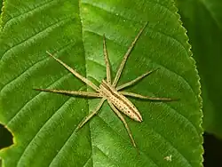 El color básico del cuerpo es marrón claro o amarillo pálido. Es alargado y delgado (de ahí el nombre común), el caparazón (prosoma) y el abdomen cilíndrico (opistosoma) muestran una gran franja marrón en la línea media de la espalda. Las patas largas y delgadas son más o menos iguales en longitud y generalmente se extienden a lo largo de los tallos u hojas de la hierba, los dos primeros pares dirigidos hacia adelante.