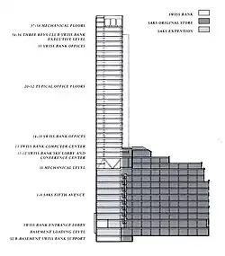 - ↑ a b c d e f g h i j k l m n «The Swiss Bank Tower and Saks Fifth Avenue». Project Monograph (Institute for Urban Design) 3 (2). August 1990. Archivado desde el original el 23 de julio de 2021. Consultado el 15 de febrero de 2021.