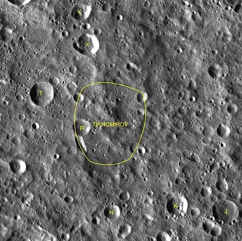 Por convención estos elementos son identificados en los mapas lunares poniendo la letra en el lado del punto medio del cráter que está más cercano a Tikhomirov.