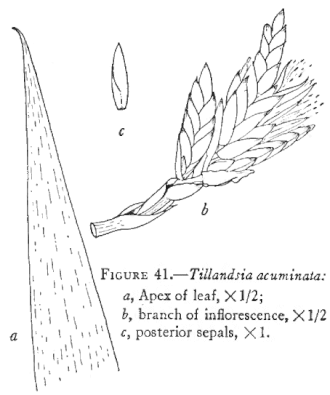 - ↑ «Tillandsia acuminata». Royal Botanic Gardens, Kew: World Checklist of Selected Plant Families. Consultado el 21 de abril de 2015.