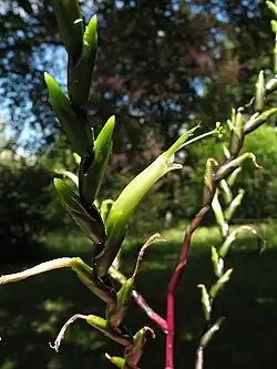 Son plantas epífitas que alcanza un tamaño de hasta 120 cm en flor, acaules. Hojas de (37-)72-76 cm; vainas (5.5-)7-8 cm de ancho, pardo claro, frecuentemente castaño basalmente, densamente lepidotas; láminas 3-3.5 cm de ancho, densamente cinéreo lepidotas, angostamente triangulares en el envés, atenuadas. Escapo 50-70 cm, típicamente más corto que las hojas; brácteas inferiores foliáceas, las superiores vaginiformes con láminas cortas e involuto-subuladas. Inflorescencia laxamente 1-pinnado compuesta, erecta; brácteas primarias reducidas, mucho más cortas que las espigas; espigas (19-)30-35 cm, patentes a ascendentes, con 9-15 flores. Brácteas florales 1.8-2.3 cm, tan largas como o ligeramente más largas que los entrenudos, más cortas que los sépalos, erectas, ecarinadas, lisas, glabras, coriáceas, los márgenes basales envolviendo al raquis. Flores con pedicelos 3-4 mm; sépalos 1.8-2.5 cm, lisos, carinados o los 2 posteriores anchamente carinados basalmente, glabros, coriáceos, libres o desigualmente brevemente connatos; pétalos blanco-verdosos. Los frutos son cápsulas de 3 cm.[1]