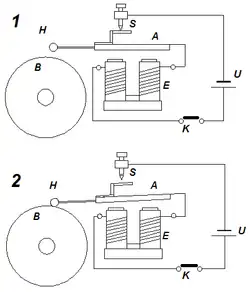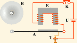 La electricidad circula por el enrollamiento del electroimán y este crea un campo magnético en su núcleo y atrae la armadura. El martillo, soldado a la armadura, golpea la campana produciendo el sonido. Al abrir el interruptor cesan la corriente y el campo magnético del electroimán, y un resorte devuelve la armadura a su posición original para interrumpir el sonido.