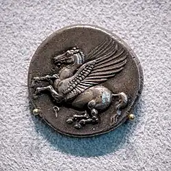 - Corinto, el Pegaso con su Neptuno sentado, llevando su tridente