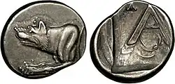 - Beocia, una mosca y un ciervo o un Dioniso con un racimo y una gran copa o cántaro