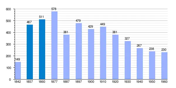 Población de derecho según los censos de población del INE Población de hecho según los censos de población del INEEntre el censo de 1857 y el anterior, crece el término del municipio porque incorpora a 255043 (Bar) |