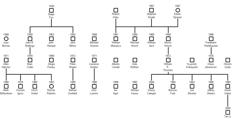 Para esta ciencia -que estudia las variedades y los encajes y encajes propios entre ellas-, estos son algunos de los temas representativos de esta ciencia: la teoría de nudos; clasificación de 3 y 4-variedades; Complementos de nudos en la n-esfera, ; Teoría topológica cuántica de campo.