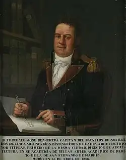 El arquitecto D. Torcuato Benjumeda (1813), óleo de Juan Rodríguez Jiménez (Museo de Cádiz). Inscripción: «D. TORCUATO JOSÉ BENJUMEDA CAPITÁN DEL BATALLÓN DE ARTILLE/ROS DE LÍNEA VOLUNTARIOS DISTINGUIDOS DE CÁDIZ, ARQUITECTO MA/YOR TITULAR PRIMERO DE LA MISMA CIUDAD, DIRECTOR DE ARQUI/TECTURA EN SU ACADEMIA DE BELLAS ARTES, ACADÉMICO DE MÉRI-/TO DE LA DE SAN FERNANDO DE MADRID./ MURIÓ EN 15 DE ABRIL DE 1836». | ||