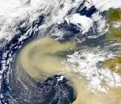 El desierto del Sahara es una fuente clave de tormentas de polvo, en particular la Depresión de Bodélé[9] y una zona que abarca la confluencia de Mauritania, Malí y Argelia.[10] El polvo del Sáhara se emite con frecuencia a la atmósfera mediterránea y es transportado por los vientos a veces hasta el norte de Europa central y Gran Bretaña.[11]