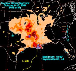 ![]() La tormenta tropical Matthew cerca de la intensidad máxima y acercándose a Louisiana el 9 de octubre de 2004 | ||