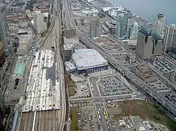 Vista de la Gardiner Expressway y de la Union Station desde la Torre CN.