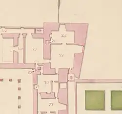 - En el cuarto principal, formó parte del cuarto de la Reina o de los cuartos de los Infantes. Por ejemplo, en 1625, según el Plano de Gómez de Mora, albergaba el cuarto (61) y oratorio (65) de la infanta María Eugenia.
