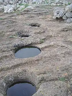 En la parte baja de la colina se encuentran algunas viviendas con sala hipóstila, o sala con columnas, estructura adosada que servía como almacén o habitación auxiliar. Otra característica a destacar del poblado talayótico es el medio de aprovechamiento del agua de lluvia, mediante filtros naturales excavados en la roca y canalizaciones que la conducían hasta grandes depósitos.