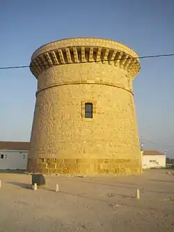 La construcción se presenta como un cono truncado, con un diámetro de seis metros en la base y de cinco en su parte más alta. La base de la torre es maciza, presentando una única habitación en el tramo superior que se cubre con una bóveda semiesférica. Existen vanos en todas las orientaciones, situándose la puerta de entrada hacia el Este. Para acceder a la misma, era necesario una escalera "de gato" o cuerda. En el interior se halla una escalera por la que se accede a la terraza superior. La estructura portante es un grueso muro de mampostería irregular, siendo la cara externa de sillarejo. La piedra de sillería se encuentra en las aperturas de los huecos, así como en las ménsulas en las que se apoya la coronación de la torre.