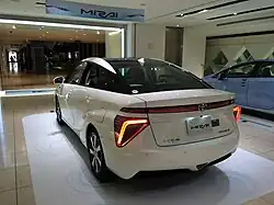 El Toyota Mirai es un vehículo de 4 plazas propulsado por un motor eléctrico alimentado por una pila de combustible suministrada por hidrógeno. Toyota anunció este vehículo en noviembre del 2014 en el Salón del Automóvil de Los Ángeles.[3] El modelo salió a la venta en Japón el 15 de diciembre de 2014 a un precio de 6.7 millones de yenes. A finales de 2015 se puso a la venta en California (Estados Unidos) por 57 400 USD.[4] En junio de 2016 se puso a la venta en Alemania, Dinamarca, Noruega y Reino Unido.