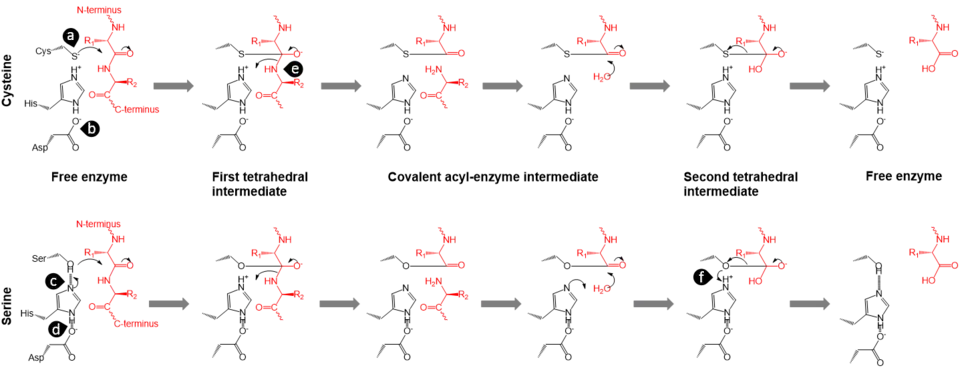 en la enzima en su estado basal[25] (a) y muchas incluso carecen del miembro acídico de la tríada (b). La serina es también más dependiente de otros residuos para reducir su pKa[24] para la desprotonación concertada con catálisis (c) para optimizar la orientación de los miembros ácido-base de las tríadas (d).[2] El bajo pKa de la cisteína funciona en contra de la resolución del primer intermediario tetraédrico ya que la reacción inversa e improductiva del ataque nucleofílico original es el producto de ruptura más favorable.[2] La base de la tríada, por lo tanto se encuentra preferentemente orientada para protonar al grupo saliente amida (e) para asegurar que es eliminado dejando al azufre unido covalentemente al extremo N-terminal del sustrato. Finalmente, la resolución del complejo acil-enzima (para liberar el extremo C-terminal del sustrato) requiere que la serina sea reprotonada (f) mientras que la cisteína puede salir como S−