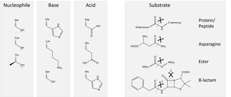 ) de una cisteína. La introducción del nucleófilo dentro de una tríada consigue hacerlo más activo desde el punto de vista catalítico. Un par de proteasas emplean el grupo alcohol secundario de una treonina, sin embargo, debido al grupo metilo extra, estas proteasas hacen uso de la amida N-terminal como la base de la tríada, en lugar de un aminoácido separado.[1][16]