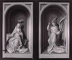Cuando el tríptico está cerrado, las alas exteriores revelan la escena de la Anunciación con el Arcángel Gabriel y María pintados en grisalla. Las figuras forman una ilusión óptica simulando esculturas, un capricho que van Eyck extiende al colocarlos en pedestales octogonales.[4] Las figuras están iluminadas por una luz desde el lado izquierdo, un artificio que el artista usaba a menudo para implicar la presencia de Dios. Una paloma, en representación del Espíritu Santo, flota sobre María. Debido a que la paloma también está pintada en grisalla, pero no adosada a algún pedestal y está flotando aparentemente sin contacto sobre los santos, su presencia sirve para resaltar que el espectador no está mirando una escultura, sino a una representación pintada de ella.[35]