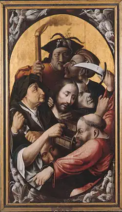 En primer lugar, en la tabla de la izquierda, se representa el Prendimiento de Cristo que acontece por la traición de uno de sus apóstoles: Judas. Este acompañó a los soldados fariseos hasta el lugar donde se encontraba Jesús orante para arrestarlo.[7] En la imagen vemos a Cristo en el centro, rodeado por los fariseos que lo encarcelan. Cabe destacar la figura de la derecha: Simón Pedro, que intenta defender a Jesús y con el cuchillo que sostiene con la mano, herir a sus oponentes.
