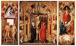 Originalmente el tríptico constaba de un panel central de 195 x 172 cm, con la Crucifixión en el interior de un templo gótico, y dos portezuelas de 195 x 77 cm, en las que estaban representados La expulsión del Paraíso y el Juicio Final, estando abiertas, y La moneda del César pintada en grisalla en las caras exteriores, componiendo una sola historia visible con las puertas cerradas. En el Museo de la Trinidad y antes de 1865 se separaron los anversos y reversos de las puertas laterales, serrando las tablas por la mitad de su grosor.[6]