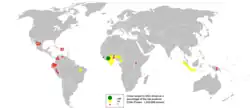 En el año de crecimiento del 2008 al 2009 —que va de octubre a septiembre—,[15]) se produjeron 3,54 millones de toneladas de granos de cacao.[3] Las naciones africanas produjeron 2,45 millones de toneladas (69 %), Asia y Oceanía 0,61 millones de toneladas (17 %) y las Américas 0,48 millones de toneladas (14 %).[3] Dos naciones africanas, Costa de Marfil y Ghana, producen más de la mitad del cacao del mundo, con 1,23 y 0,73 millones de toneladas respectivamente —35 % y 21 %, respectivamente—.[3]