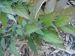 Planta perenne, casi glabra, de base leñosa, de hasta 1 m de alto. Hojas laternas, ovaladas hasta acorazonadas, cortamente pecioladas, con el margen doblemente aserrado y normalmente ciliado, de hasta 10 cm de largo y 4-7 cm de ancho. Flores pequeñas, en inflorescencias umbeladas, terminales, normalmente gruesas, de hasta 10 cm de ancho. Cáliz dividido en 5 partes. Corola con tubo estrecho, de más o menos 5 mm de largo y con 5 pétalos libres, cortos, violeta azulado, raramente blanco. 5 estambres con filamentos glabros y anteras libres. Estilo que sobresale mucho de la flor, con el ápice engrosado, con 2-3 estigmas. Ovario ínfero; cápsula que se abre con 2-3 poros.[1]