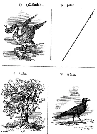 - ↑ Mathews, R. H. (Jul.–Dec. de 1903). «Languages of the Kamilaroi and Other Aboriginal Tribes of New South Wales». The Journal of the Anthropological Institute of Great Britain and Ireland 33: 259-283.