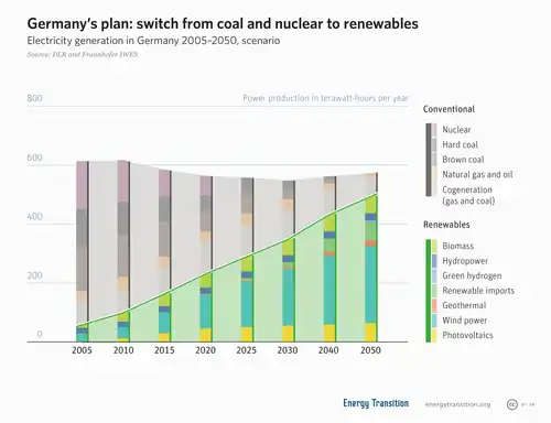 Un ejemplo de transición hacia la energía sustentable es el cambio de Alemania (Energiewende, en alemán)[48] a la energía renovable descentralizada y a la eficiencia energética. Aunque hasta ahora a través de estos cambios se haya estado reemplazando la energía nuclear, el objetivo declarado de estos países —fijado en 2012— fue la eliminación del carbón, la reducción de las fuentes de energía no renovable[49] y la creación de un sistema energético con base en un 60 % de energía renovable para 2050.[50] A partir de 2018, los objetivos de la coalición 2030 incluyen lograr en Alemania un 65 % de energías renovables en la producción de electricidad hasta 2030.[51]