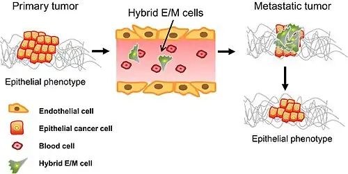 El inicio de la metástasis requiere invasión, permitida mediante la EMT.[21] Las células cancerosas de los tumores primarios pierden sus adhesiones intercelulares por una represión de E-cadherinas y la ruptura de la membrana basal, incrementando así las propiedades invasivas y permitiendo el ingreso al flujo sanguíneo por intravasación. Después, cuando estas células tumorales circulantes (CTCs) se salen de los vasos sanguíneos y forman micro-metástasis, pasan por la MET y crecimiento clonal en zonas metastáticas.[22] Se puede apreciar entonces que la EMT y la MET están al inicio y al final del proceso de metástasis.