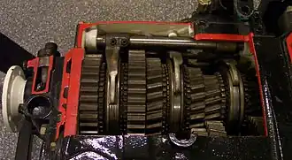 Los engranajes del eje principal y el eje intermedio o de entrada y de salida forman pares y se engranan entre sí. Un engranaje está montado permanentemente en su eje, y el otro gira libremente pero fijado axialmente. Para crear una conexión por fricción entre el eje y el engranaje que gira libremente, este se fija al eje con un embrague de empuje. Un acoplamiento de cuñas está unido al eje para que no pueda girar y sea desplazable axialmente. Se disponen perfiles de dientes en los flancos, cuyas contrapartes se encuentran en el flanco del engranaje. Para un proceso de cambio, la horquilla de cambio presiona el embrague de garras contra una marcha. Si los perfiles de los dientes encajan, el engranaje se acopla. Como regla general, los engranajes están dentados helicoidalmente, lo que permite un cambio de marcha más suave que con el engranaje deslizante anteriormente generalizado. Para mantener bajo el desarrollo de ruido y poder transmitir pares más grandes, varios dientes están engranados constantemente. Sin embargo, el engranaje helicoidal crea fuerzas axiales que deben ser absorbidas por el rodamiento, con la excepción de los dientes en espiga. Allí, la disposición helicoidal de uno de los engranajes opuestos compensa las fuerzas axiales. Se requiere una inversión de la dirección de rotación para la marcha atrás. Esto se logra con otro engranaje.[21] Forzar las marchas puede dañar los dientes del cambio.