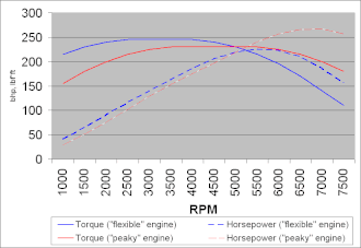 - Si la configuración de marchas es demasiado larga, el motor no alcanza su velocidad nominal en la marcha más alta, y por lo tanto, tampoco su potencia máxima: la velocidad máxima del vehículo se alcanza a menudo en la siguiente marcha más baja. La desventaja de este diseño de engranajes es que no se optimizan las prestaciones del vehículo, y su principal ventaja es que a velocidades de circulación altas se reduce la velocidad de giro del motor, que funciona más silenciosamente y consume menos.