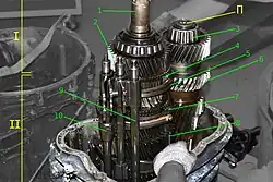 - Los ejes intermedios están conectados a su vez a varios pares de engranajes (relaciones de engranajes) en el lado de salida del eje principal.
