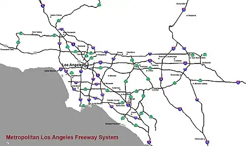 Los Ángeles es el nudo central de una red de autopistas muy importante, a la que se le estima una longitud de 1000 kilómetros al nivel de la aglomeración.[3]​ Sus autopistas monopolizan desplazamientos cotidianos de 160 millones de kilómetros. La calidad de la red es reconocida, pero el aumento creciente de los embotellamientos desde hace varios años obliga a las autoridades a desarrollar medios de transporte alternativos.