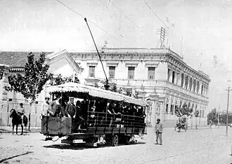 La ciudad de La Plata fue elegida para ensayar el tranvía impulsado por un motor eléctrico. El hecho de que la ciudad contara con un sistema de alumbrado público eléctrico[4]​ la hacía mucho mejor equipada que Buenos Aires para este experimento. Para ello se tendió un tramo de vías en la avenida 7 entre las calles 45 y 50, con una línea eléctrica aérea. Se realizaron dos ensayos, el primero de ellos el 23 de octubre de 1892, y el segundo el 9 de noviembre de ese mismo año. El temor de los pasajeros a ser electrocutados, sumado al chisporroteo del trole y las ruedas, hizo que la ciudad continuara con el tranvía a caballo hasta 1910.[5]
