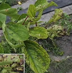- ↑ a b Schutzki, R.E. (2007). «Abiotic plant disorders: Symptoms, signs and solutions. A diagnostic guide to problem solving». Michigan State University Department of Horticulture. Michigan State University. Archivado desde el original el 24 de septiembre de 2015. Consultado el 10 de abril de 2015.