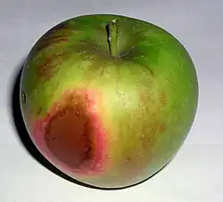 El granizo puede dañar las frutas de piel blanda y también puede permitir que la podredumbre marrón u otros hongos penetren en la planta. Las manchas o líneas marrones en un lado de una manzana madura son indicativas de una tormenta de granizo de primavera.