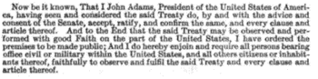 Ahora sea sabido, que yo, John Adams, presidente de los Estados Unidos de América, habiendo visto y considerado dicho tratado, con el consejo y consentimiento del Senado, lo acepto, ratifico y confirmo, y cada cláusula y artículo del mismo. Y con el fin de que dicho tratado sea observado y ejecutado de buena fe por parte de los Estados Unidos, he ordenado que lo anterior sea hecho público; y por la presente ordeno y requiero a todas las personas que ejerzan un cargo civil o militar dentro de los Estados Unidos, así como a todos los demás ciudadanos o habitantes del mismo, observar y cumplir fielmente dicho tratado y cada cláusula y artículo del mismo.